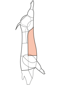 Das Bauchfleisch liegt im Bereich des hinteren Brustkorbs und reicht bis zum Schlussbraten, der wiederum Teil des Schlögels ist.