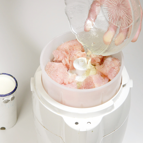 - Das Eiklar zum grob zerkleinerten Fleisch geben.