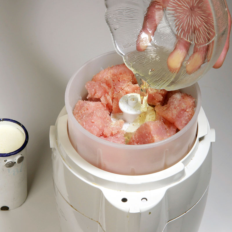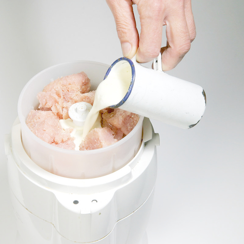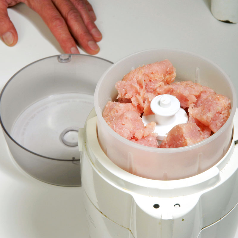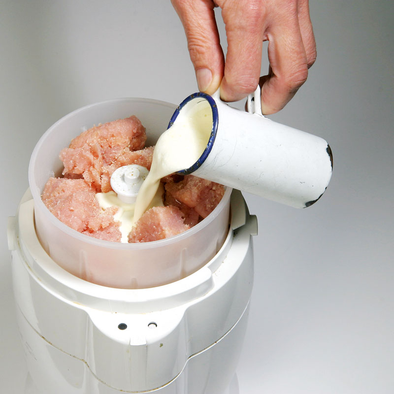 - Fleisch in Stücke schneiden und in den Mixer (Cutter) geben. Eventuell mit Kräutern und Gewürzen verfeinern. Mit Salz und Pfeffer würzen. Das zerkleinerte Geflügelfleisch vor der Weiterverarbeitung bzw. der Eiklarzugabe ca. 1/2 Stunde in den Tiefkühler stellen.