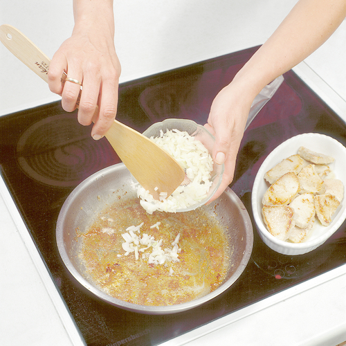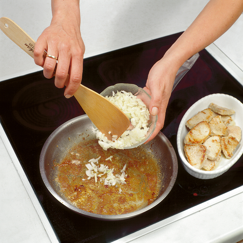 - Fleisch aus der Pfanne nehmen und warm stellen. Im Bratensatz die fein geschnittene Zwiebel goldgelb anrösten.