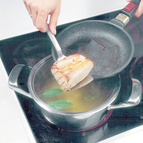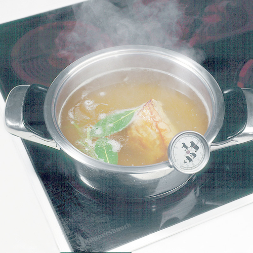 - Danach das Fleischstück in die siedende Suppe (ca. 80 °C) einlegen und ziehen lassen. Je kräftiger die Suppe, desto intensiver ist der Geschmack des Fleisches.