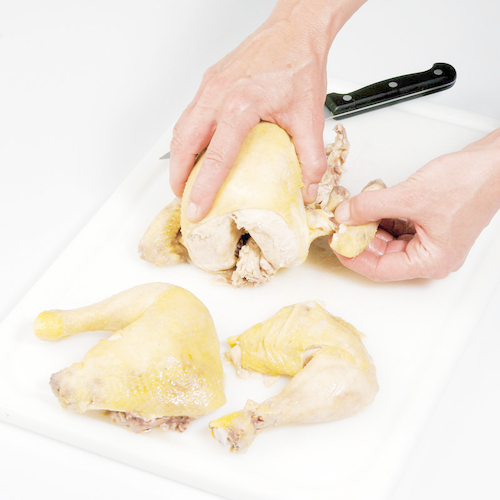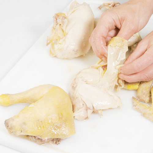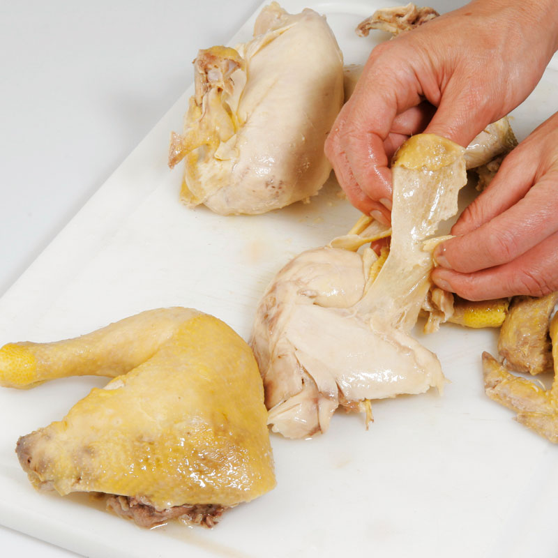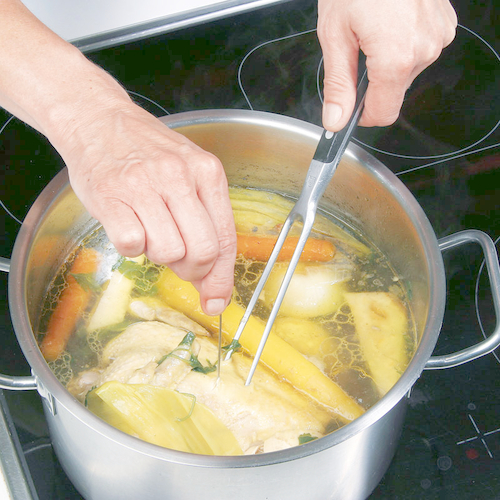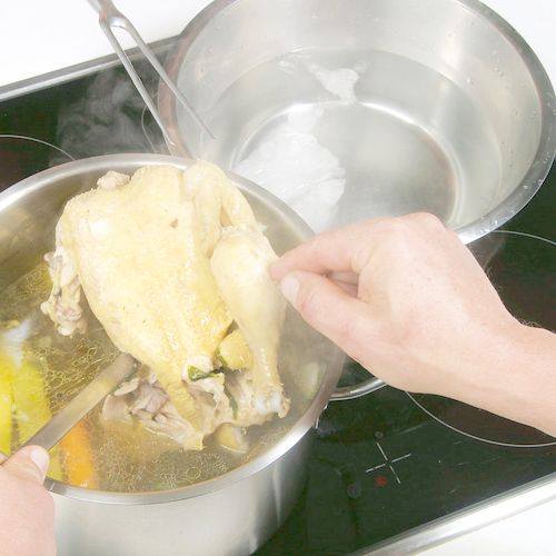 - Gekochtes Huhn aus der Suppe heben und mit kaltem Wasser abschrecken.