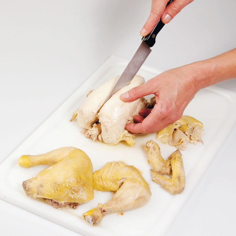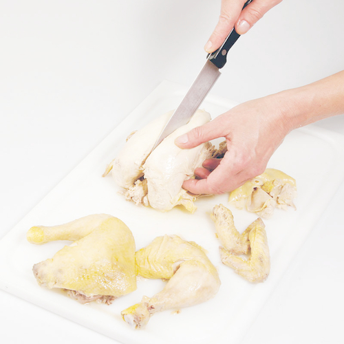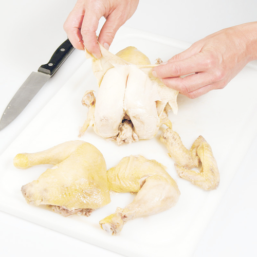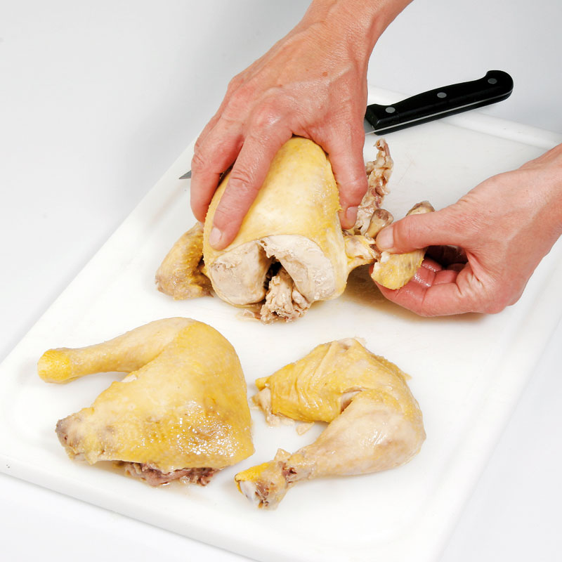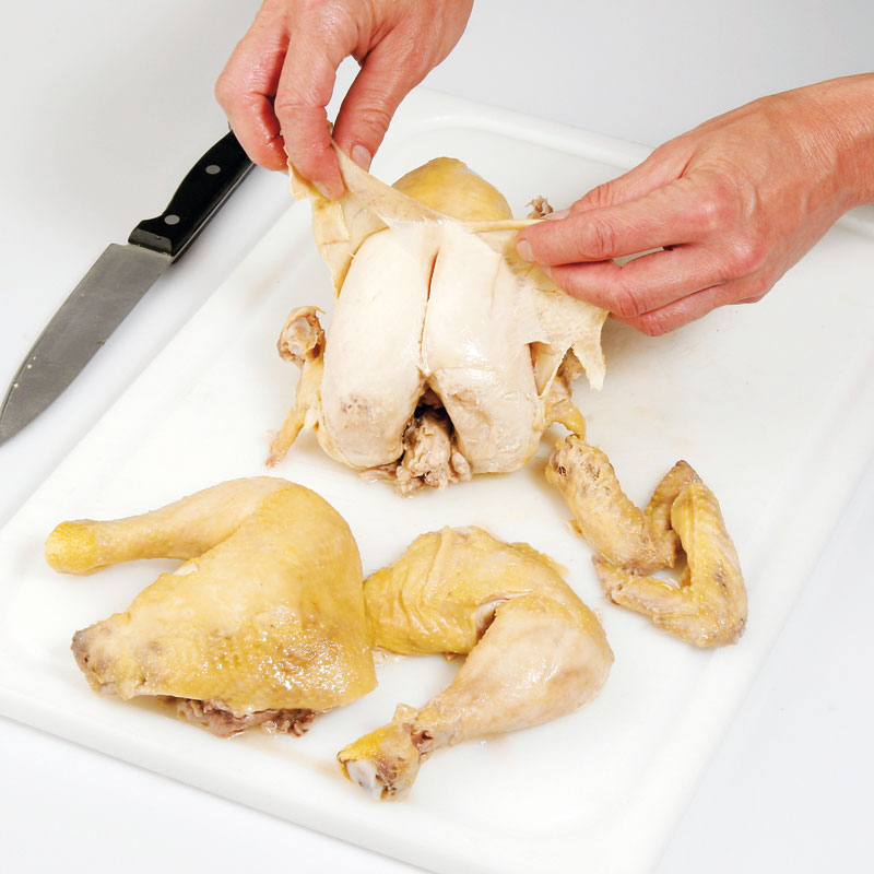 - Huhn in Rumpf, Keulen und Flügel zerteilen.