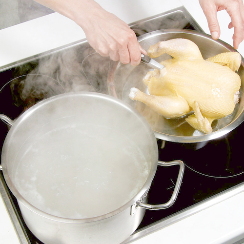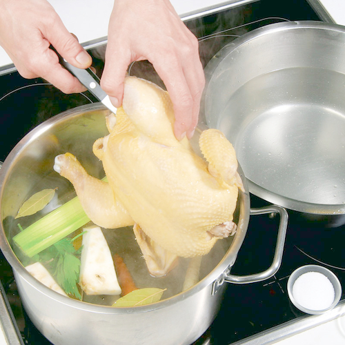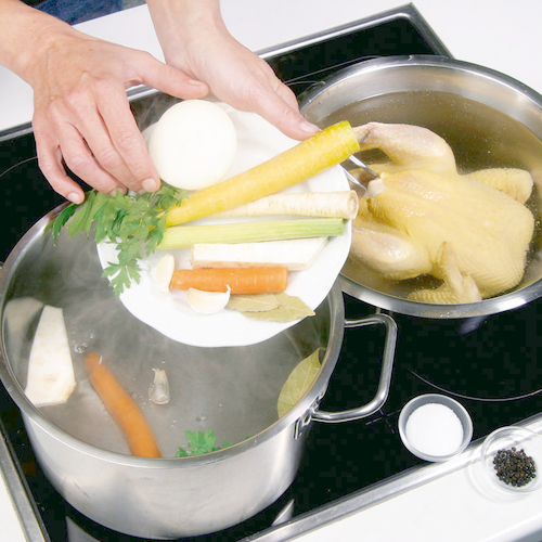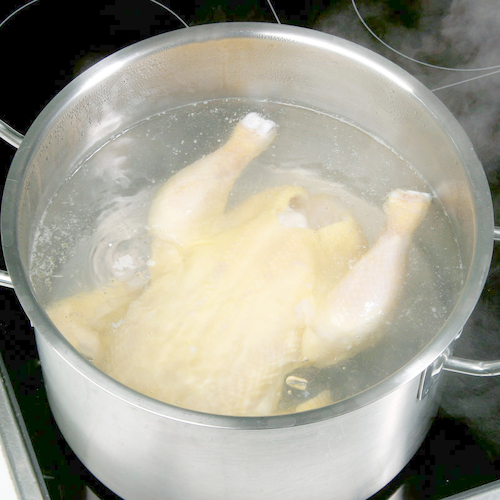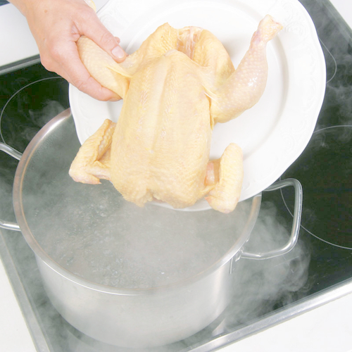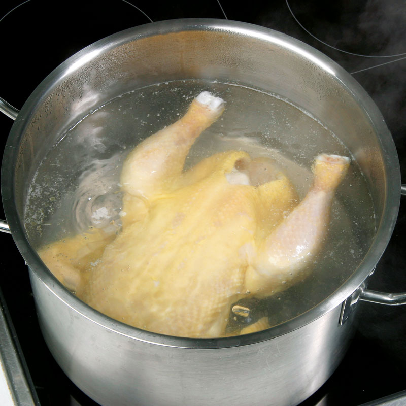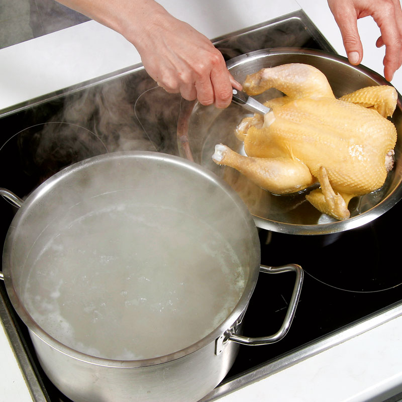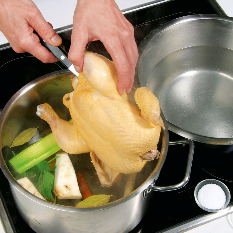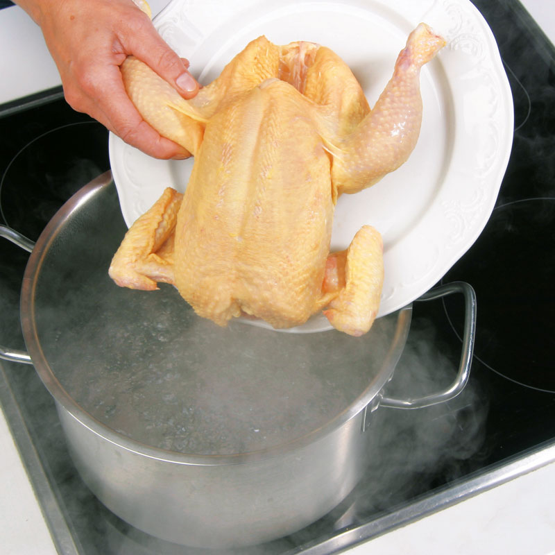 - Reichlich Wasser in einem großen Topf zum Kochen bringen und Huhn einlegen.