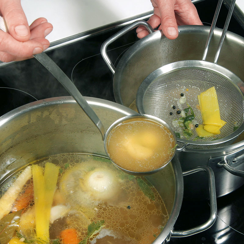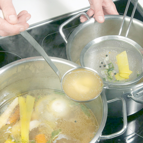 - Suppe abseihen, abschmecken und abkühlen lassen.