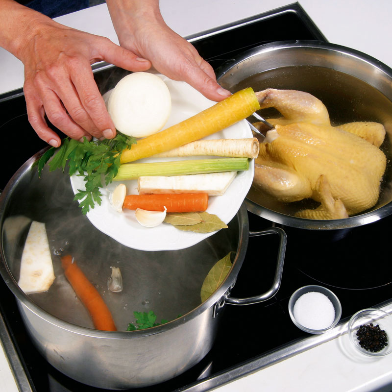 TIPP: Vorsicht: Zu viel Sellerie färbt das Fleisch rot, zu viele Karotten lassen die Suppe sehr süß werden, zu viel Lauch färbt die Suppe grünlich (deshalb eher helle Teile verwenden). Während des Kochens sollte das Geflügel ständig mit Flüssigkeit bedeckt sein. Die Suppe sollte nur schwach wallend kochen, sonst wird sie trüb. Nicht zudecken!