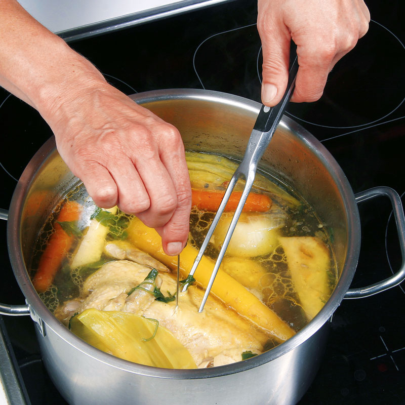 - Nach ca. einer Stunde mit einer Fleischnadel prüfen, ob das Huhn gar ist. (Das Huhn ist gegart, wenn sich die Fleischnadel mühelos ins Fleisch stechen lässt.)