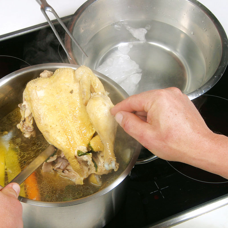 - Huhn aus dem Topf nehmen und in einer Schüssel mit kaltem Wasser abschrecken. (Diese Vorgangsweise beseitigt unangenehme Gerüche sowie Geschmackstoffe und bewirkt, dass die Hühnersuppe klar wird.)